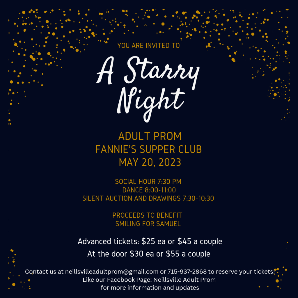 Advanced tickets are $25 ea or $45 for a couple and can be reserved by contacting neillsvilleadultprom@gmail.com or 715-937-2868.